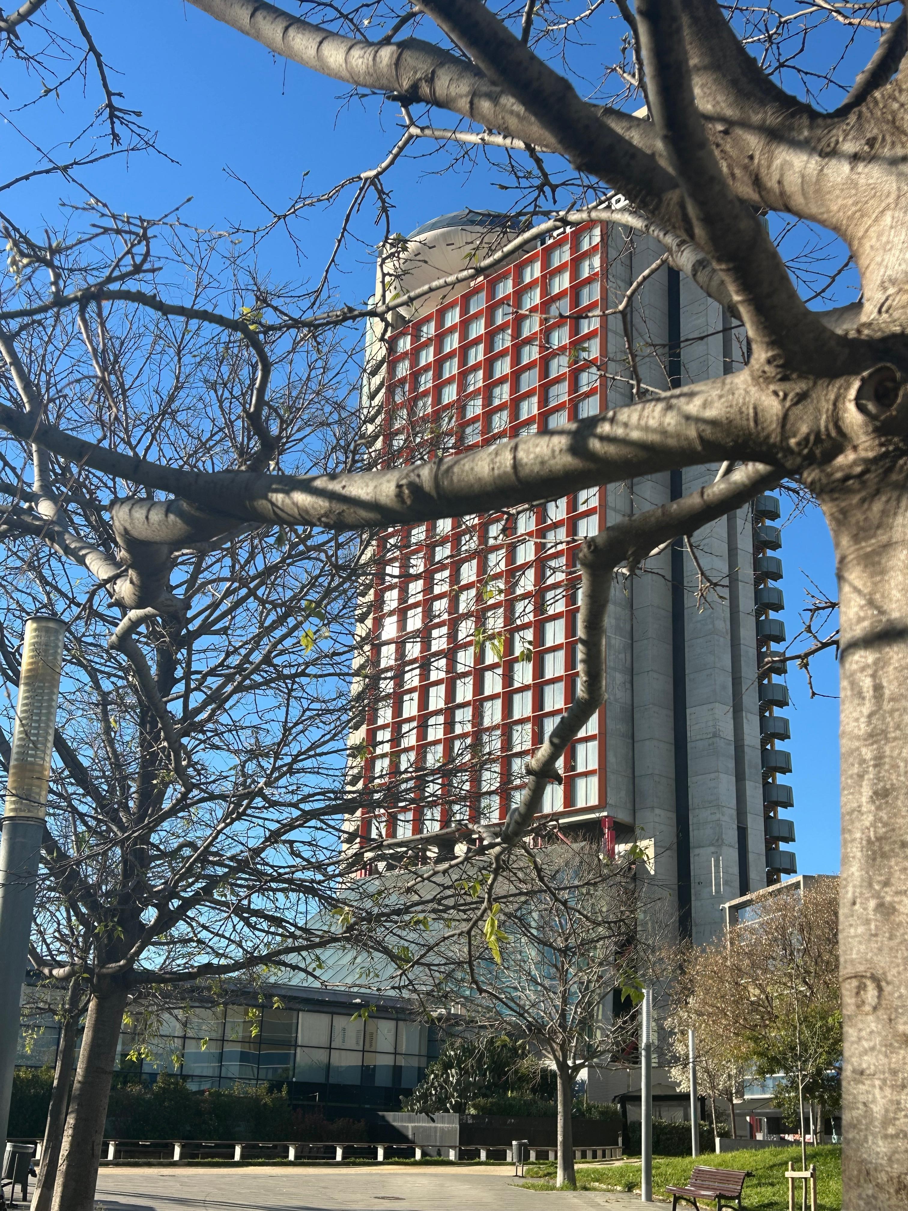 This is a beautiful hotel! The huge screen in the lobby is amazing! They were so accommodating and upgraded our room to a beautiful room on the 22nd floor with a spectacular view of a Barcelona. I w would definitely stay here again! Highly recommend!