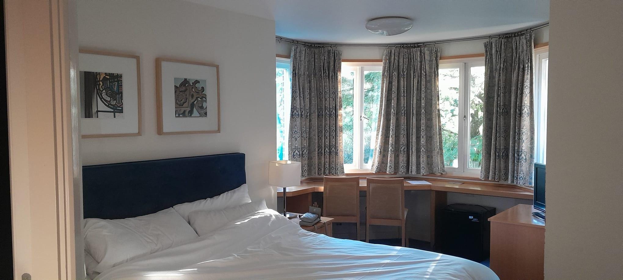Large tower twin room with good view over gardens. Decent shower but very variable temperature. Replacement tv on desk not original walll mount gaveimited view. No evening hot food available at bar.