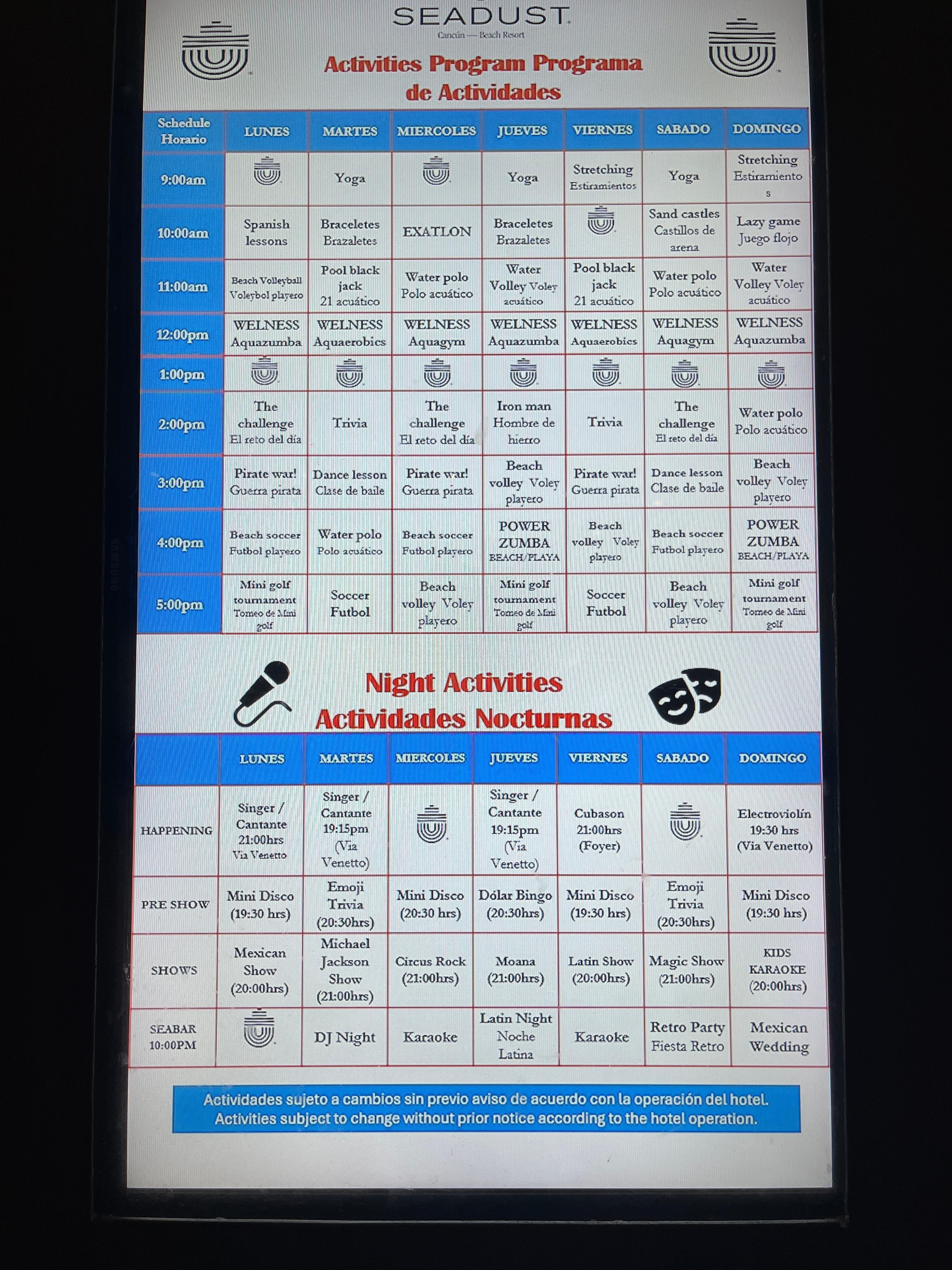 The hot tube was never hot, no activities for adults, only 1 restaurant option for breakfast and lunch,adult drink menu limited and bars close at 11pm so if you want to party you’re unable to. Not really alot of activities for kids. Checking in and checking out was extremely slow despite open counters being open. They just stand around and say they can’t help you. I wouldn’t recommend.