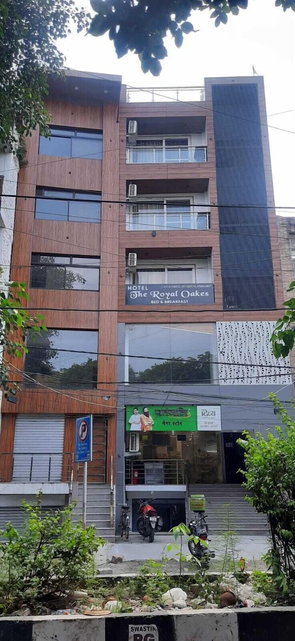 เดอะ รอยัล โอ๊คส์ ซึ่งตั้งอยู่ใกล้กับ ประตูอินเดีย และ Pragati Maidan มีฝ่ายต้อนรับให้บริการฟรีทุกวัน สวน และห้องอาหารผู้เข้าพักสามารถเชื่อมต่อกับWi-Fi ฟรีในห้องพัก