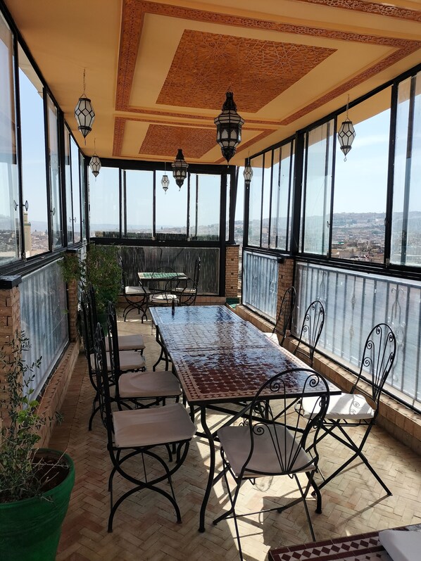 Travelers unwind on a peaceful rooftop terrace with views of Fes' ancient medina while savoring authentic Moroccan dishes in an intimate setting