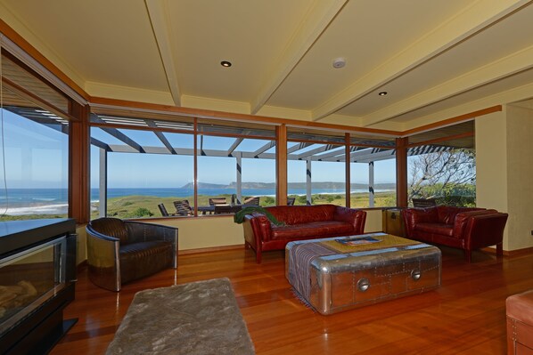 บ้านพักพาโนรามิก, 3 ห้องนอน, วิวทะเล, ริมทะเล | ห้องนั่งเล่น | ทีวีจอแบน, เตาผิง, เครื่องเล่นดีวีดี