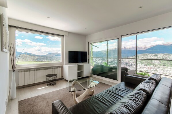อพาร์ทเมนท์, ลานระเบียง, วิวเมือง | บริเวณนั่งเล่น | ทีวีจอแบน 32 นิ้ว พร้อมช่องดาวเทียม