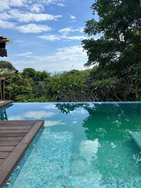 Travelers lounge by the peaceful outdoor pool at Dan's Koyao Retreat, enjoying delicious treats from the bar while surrounded by tranquility