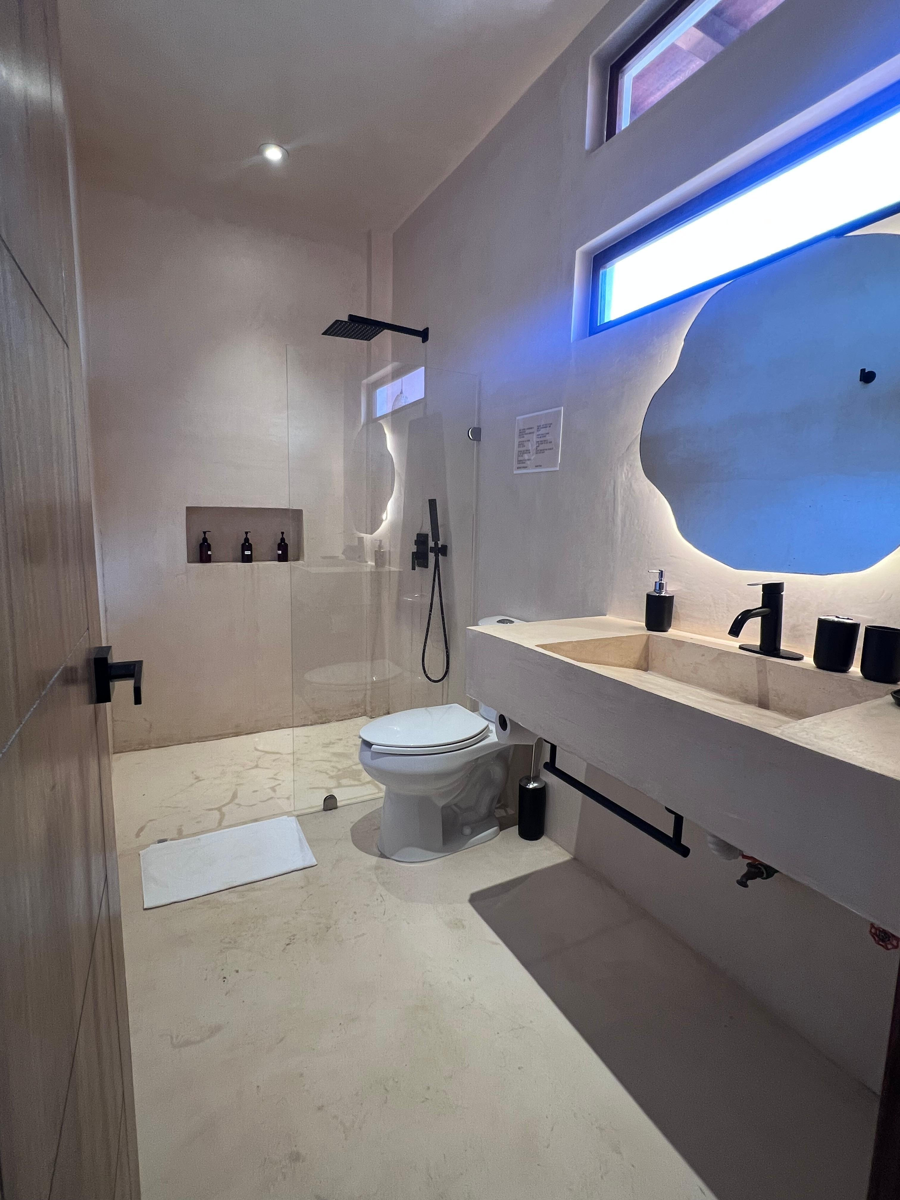 Bathrooms with rainfall showers and shampoo