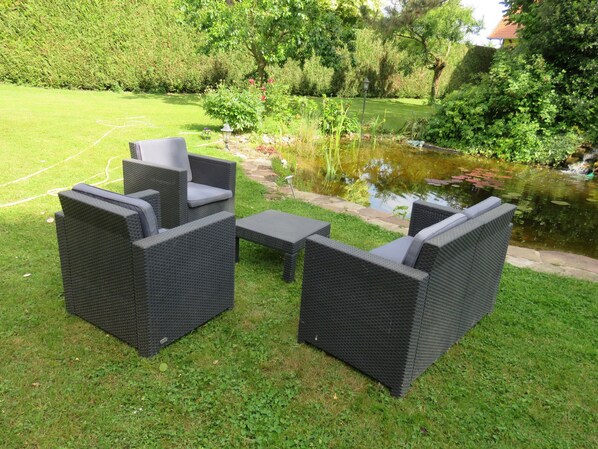 Travelers enjoy continental breakfast in a peaceful setting at Chambres d'Hôtes au Vallon du Rosenmeer, relaxing on the quiet terrace or exploring the area