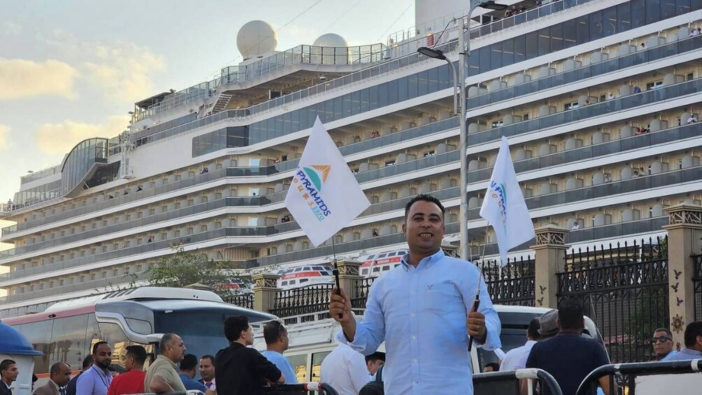 ตัวแทนของเราจะต้อนรับคุณอย่างอบอุ่นด้วยบริการ Meet and Greet โดยถือป้ายชื่อของคุณที่ท่าเรืออเล็กซานเดรียเมื่อเรือสำราญของคุณมาถึง