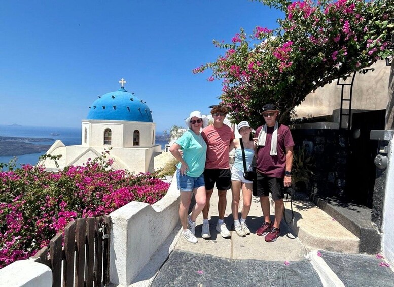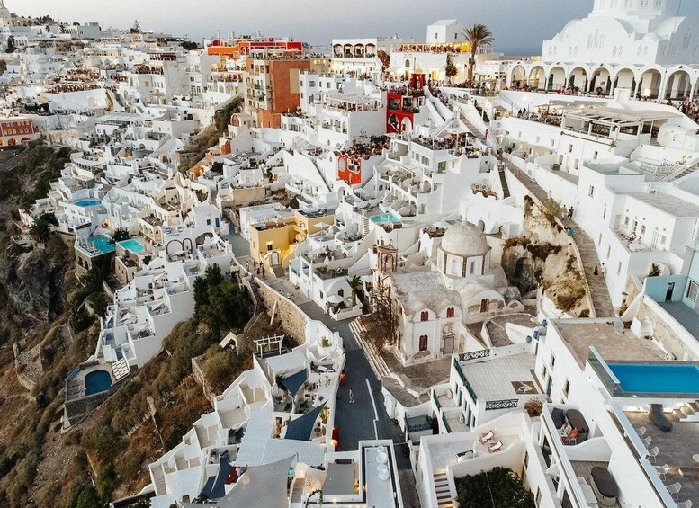 การเดินทางของคุณจะพาคุณไปที่หมู่บ้าน Oia ที่มีชื่อเสียงซึ่งโด่งดังในเรื่องโดมสีฟ้าอันเป็นเอกลักษณ์และพระอาทิตย์ตกที่สวยงามตระการตา สำรวจโบสถ์อันน่าทึ่งของ Agios Spiridonas และ Anastaseos และเยี่ยมชมจุดถ่ายภาพที่ไม่ควรพลาดเช่น บ้าน Kastro Oia กังหันลมที่งดงาม และปราสาท Oia อันเก่าแก่ ซึ่งคุณสามารถเก็บภาพทิวทัศน์ของปล่องภูเขาไฟที่น่าประทับใจไม่รู้ลืม ต่อไปเราจะเดินทางต่อไปยังเมืองอิเมโรวิกลี ซึ่งมักเรียกกันว่า “ระเบียงสู่ทะเลอีเจียน” ที่นี่คุณจะเพลิดเพลินไปกับทัศนียภาพอันงดงามของหินสการอสและเกาะภูเขาไฟโดยรอบ ทำให้ที่นี่เป็นจุดที่สมบูรณ์แบบสำหรับผู้รักธรรมชาติและช่างภาพ ชื่นชมความสวยงามของโบสถ์ Anastasis และ Malese ที่มีโดมสีฟ้าอันโดดเด่นตัดกับท้องทะเล ในที่สุดทัวร์ของคุณจะสิ้นสุดที่ Firostefani ซึ่งเป็นที่ตั้งของโบสถ์ Three Bells แห่ง Saint Theodoros อันน่าทึ่ง ซึ่งเป็นสัญลักษณ์ของมรดกอันล้ำค่าของเกาะซานโตรินี หลังจากใช้เวลาทั้งวันกับสถานที่ท่องเที่ยวและประสบการณ์ที่ไม่มีวันลืม เราจะไปส่งคุณที่สถานที่ที่คุณต้องการ พร้อมทิ้งความทรงจำอันยาวนานของเกาะอันน่าหลงใหลแห่งนี้ไว้กับคุณ