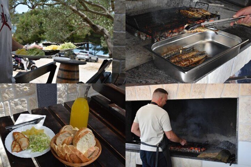 Your first stop is the beach bar Borko on Čiovo Island. Sip refreshing drinks while taking in the breathtaking cove and relaxing on a beautiful beach. The restaurant is located just steps from the shore, offering a perfect setting for lunch after a refreshing swim. You'll be treated to a true Mediterranean feast — grilled fish, grilled vegetables, or grilled meat, all prepared in traditional Dalmatian style.