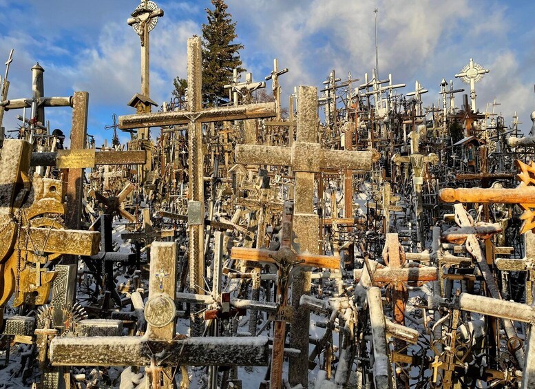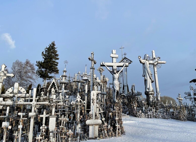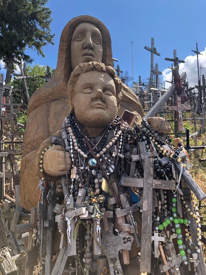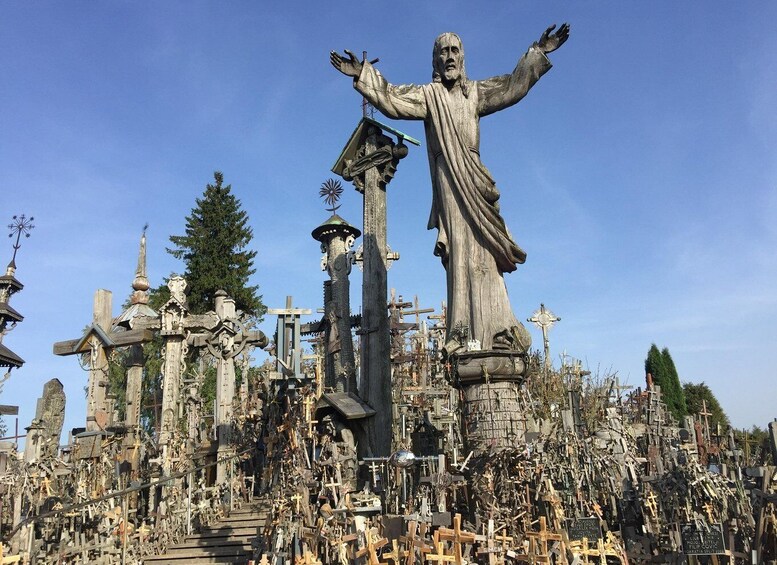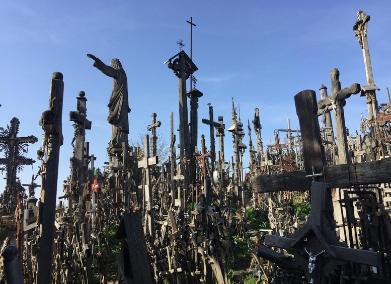 Next stop will be Tytuvenai monastery. Tytuvėnai’s Church of Our Lady of the Angels and Bernardine monastery complex are among Lithuania’s largest and most significant specimens of 17th and 18th century sacred architecture, reflecting as they do a multi-layered harmony of the Gothic, Mannerist and Baroque styles. The last stop of the tour is the Hill of Crosses. The Hill of Crosses has about 100,000 crosses, it is a historical architectural monument and a unique composition of folk art. The Hill of Crosses in Lithuania left a deep impression on Pope John Paul II. After the tour, head back to Vilnius.