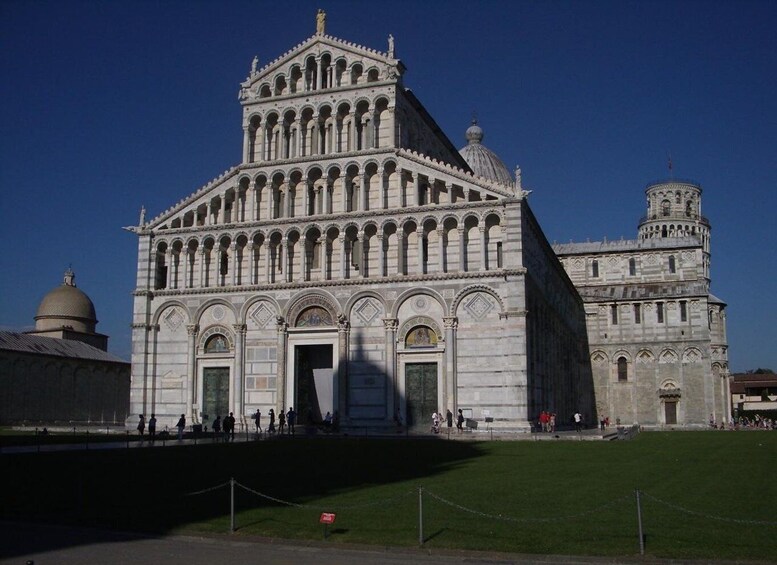 เริ่มต้นทัวร์ที่ Piazza dei Miracoli ซึ่งเป็นจัตุรัสที่มีเสน่ห์ซึ่งคุณจะได้พบกับไกด์ของคุณ ชมวิวอันน่าทึ่งของอาสนวิหาร หอล้างบาป สุสานขนาดใหญ่ และหอเอนอันเลื่องชื่อ