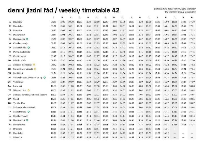 by its historical design and the number 42. Show the voucher to the staff on the tram. Tram is leaving from the meeting point Náměstí Republiky stop at 9:52, 10:22, 10:52, 11:22, 11:52, 12:22, 12:52, 13:22, 13:52, 14:22, 14:52, 15:22, 15:52, 16:22, 16:52, 17:22.
