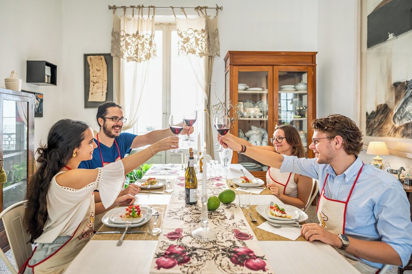 รับประทานพาสต้าและทีรามิสุเป็นกลุ่มเล็กๆ ที่บ้านของคนท้องถิ่นในเมืองโอลเบีย