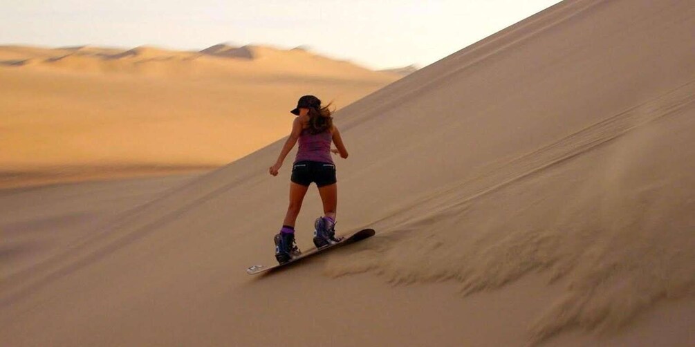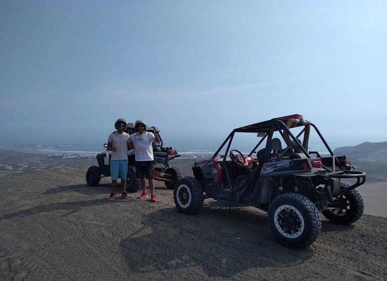 Once there, the pilot in charge will perform small manoeuvres with the all-terrain vehicle to enjoy the beautiful stepped dunes. Once we have all the equipment ready and the lesson learned, it will be time to jump into the sand of the Chilca desert and begin the sandboarding experience!