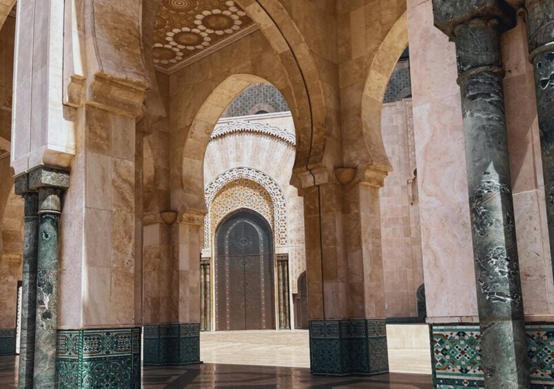เมื่อเดินทางมาถึงคาซาบลังกาแล้ว ให้สำรวจย่าน Habbous Quarter ซึ่งมีชื่อเสียงในเรื่องสถาปัตยกรรมแบบดั้งเดิมและแบบอาณานิคม ตลาดนัดอันเงียบสงบ และร้านเบเกอรี่ชื่อดัง จากนั้น เพลิดเพลินกับการแวะสั้นๆ ที่จัตุรัสโมฮัมเหม็ดที่ 5 ซึ่งเป็นจัตุรัสที่เต็มไปด้วยชีวิตชีวา รายล้อมไปด้วยอาคารประวัติศาสตร์และน้ำพุที่มีชีวิตชีวา จุดเด่นของทริปนี้คือมัสยิด ฮัสซันที่ 2 ซึ่งเป็นผลงานทางสถาปัตยกรรมอันสวยงามที่มองเห็นวิวมหาสมุทรแอตแลนติก มัสยิดอันเป็นสัญลักษณ์แห่งนี้สร้างขึ้นในปี 1993 มีลักษณะเด่นคือโมเสกอันวิจิตรบรรจง เสาหินอ่อน และหลังคาที่เปิดปิดได้ ค่าธรรมเนียมการเยี่ยมชม 1 ชั่วโมง 10 นาที คือ 140 MAD (€14) และไม่รวมอยู่ในราคาทริป
