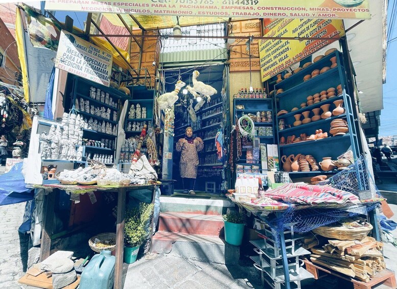 We'll start the tour at the iconic Witches' Market, right in the heart of La Paz. There, you can stroll among colourful souvenir stalls, take photos, and learn about the ancestral traditions of Andean culture.