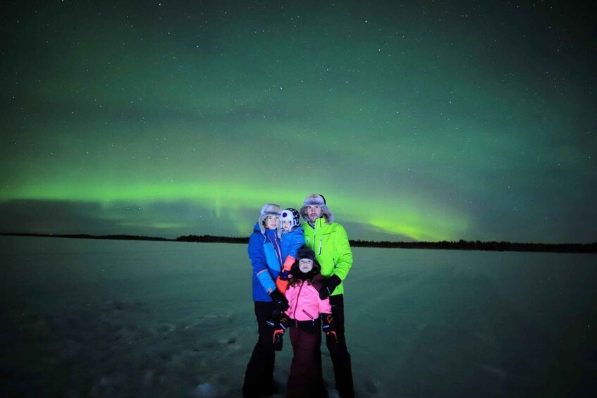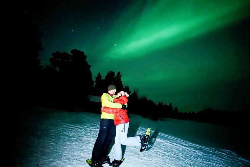 The experience unfolds on a remote lake surrounded by forest, offering one of the best natural spots to witness the Northern Lights, moon, and a star-filled sky far from city lights. If you're feeling adventurous, we’ll provide snowshoes so you can walk on the frozen lake and truly feel the silence and magic of Lapland’s wild nature.