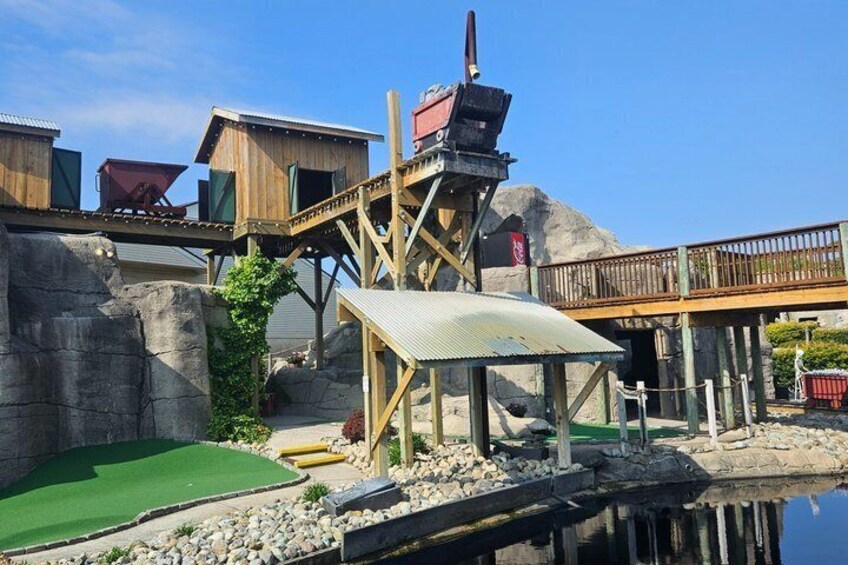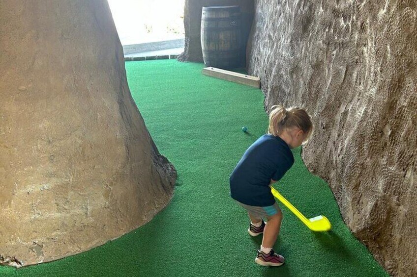 Have fun playing 18 holes of adventure mini golf. Go to the ticketing counter and get your putter and golf ball. When you're done, see if you won your mystery hole.