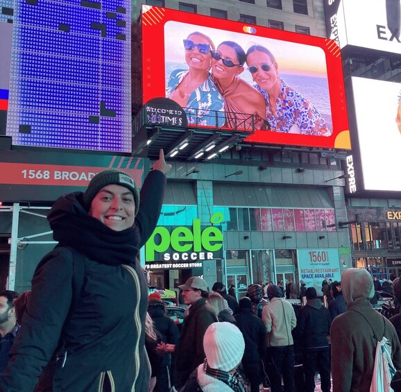ยกระดับการเข้าพักของคุณในนิวยอร์คด้วยการอัปโหลดรูปภาพหรือวิดีโอที่คุณเลือกเพื่อแสดงต่อทุกคนที่มาเยี่ยมชมไทม์สแควร์ รูปภาพของคุณจะทำให้ป้ายโฆษณาขนาดใหญ่สว่างไสวใจกลางไทม์สแควร์ รูปภาพหรือวิดีโอของคุณจะแสดงเป็นเวลา 15 วินาทีต่อชั่วโมงเป็นเวลา 24 ชั่วโมง คุณจะพบป้ายโฆษณาอยู่เหนือร้าน Pelé และอยู่ตรงข้ามกับบันไดสีแดงอันโด่งดังของ TKTS
