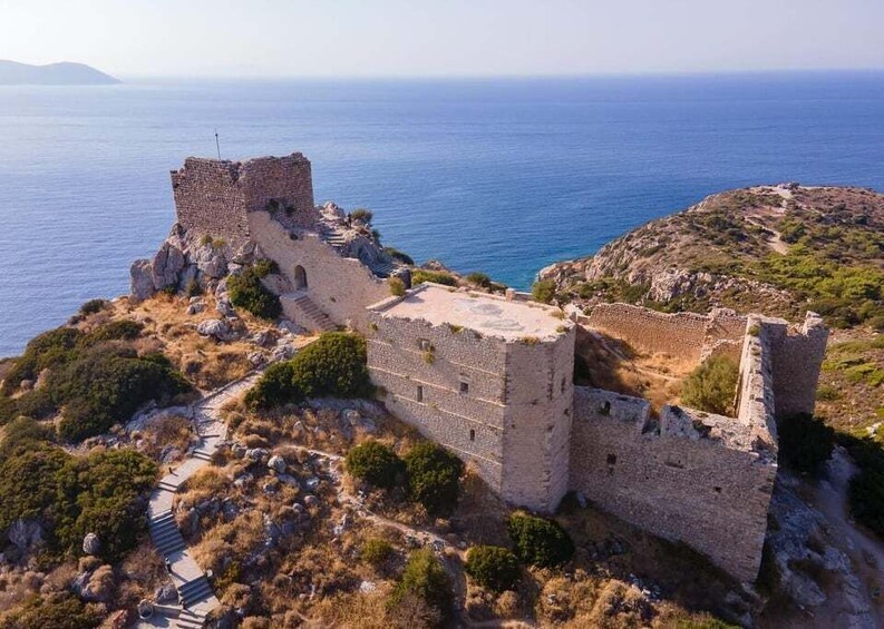 ปราสาท Kritinia: ป้อมปราการที่ก่อตั้งโดยอัศวิน ทิวทัศน์มุมกว้างของชายฝั่งตะวันตก