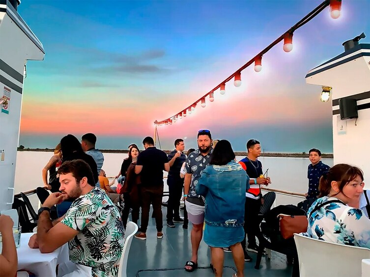 ชั่วโมงแรกจะจัดขึ้นโดยเรือจะจอดทอดสมออยู่ในท่าเรือ ซึ่งคุณสามารถสำรวจดาดฟ้า นั่งพักผ่อนในเลานจ์ที่มีกระจกและควบคุมอุณหภูมิ และเริ่มเพลิดเพลินกับเครื่องดื่ม เบียร์ และโซดาไม่อั้นจากบาร์เปิดของเรา ขณะที่บรรยากาศเต็มไปด้วยดนตรีและพลังงานที่ดี