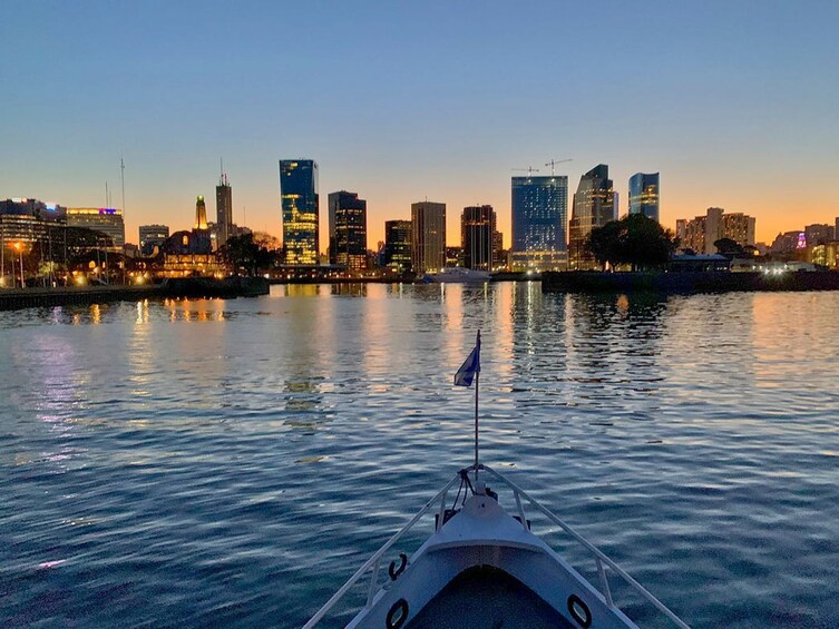 จากนั้นก็มาถึงช่วงเวลาที่ทุกคนรอคอยมากที่สุด เรือจะเคลื่อนตัวออกจากท่าเรือเพื่อพาคุณล่องเรือไปตามแม่น้ำ Río de la Plata เป็นเวลาหนึ่งชั่วโมงขณะพระอาทิตย์ตกดิน จากดาดฟ้าเปิดโล่ง คุณจะชมเมืองที่สว่างไสวด้วยแสงอาทิตย์สุดท้าย พร้อมชมทัศนียภาพชายฝั่งบัวโนสไอเรสอันเป็นเอกลักษณ์